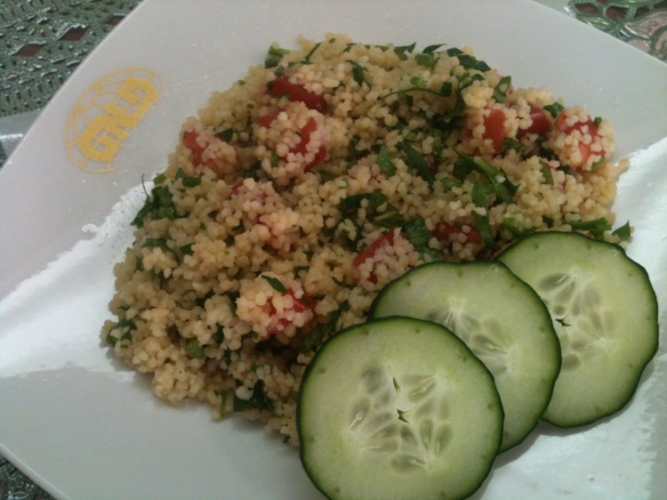 2. Calentar dos tazas de agua a punto de ebullición con un poco de sal y aceite de oliva. Justo cuando suelte el hervor, retirar del fuego y verter sobre el cous cous para hidratarlo. Se puede remover un poco el cous cous para que el agua se distribuya bien, pero no se debe revolver demasiado. Dejar enfriar la mezcla a temperatura ambiente.